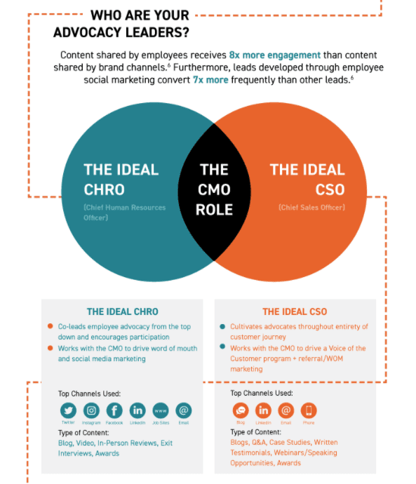 Too often there is an assumption that the CMO is solely responsible for advocacy efforts. While the marketing department is typically the catalyst, these efforts will only get so far without the help of the sales and human resource departments.