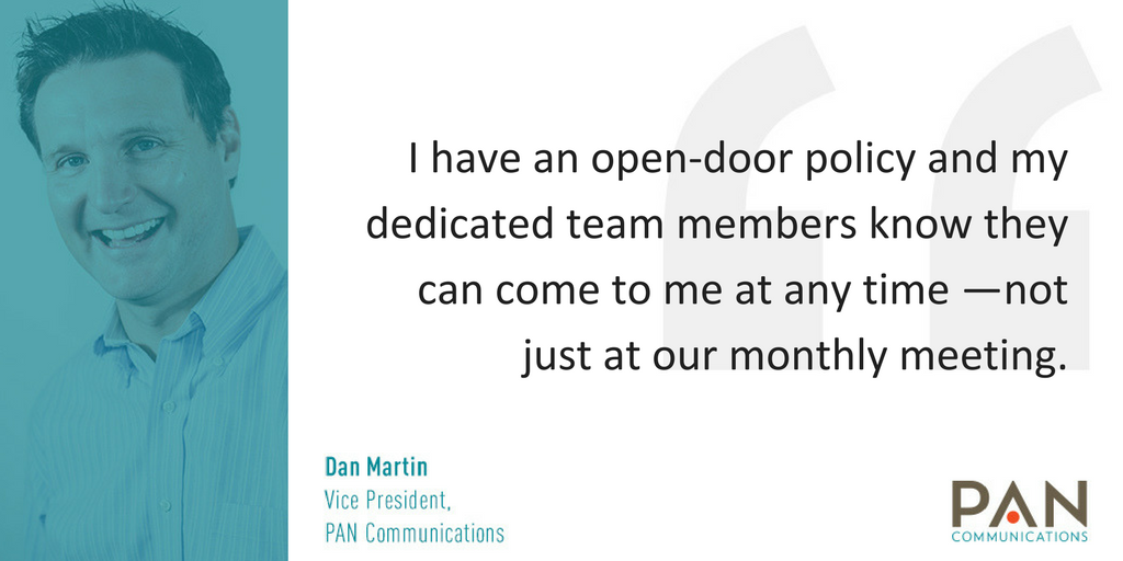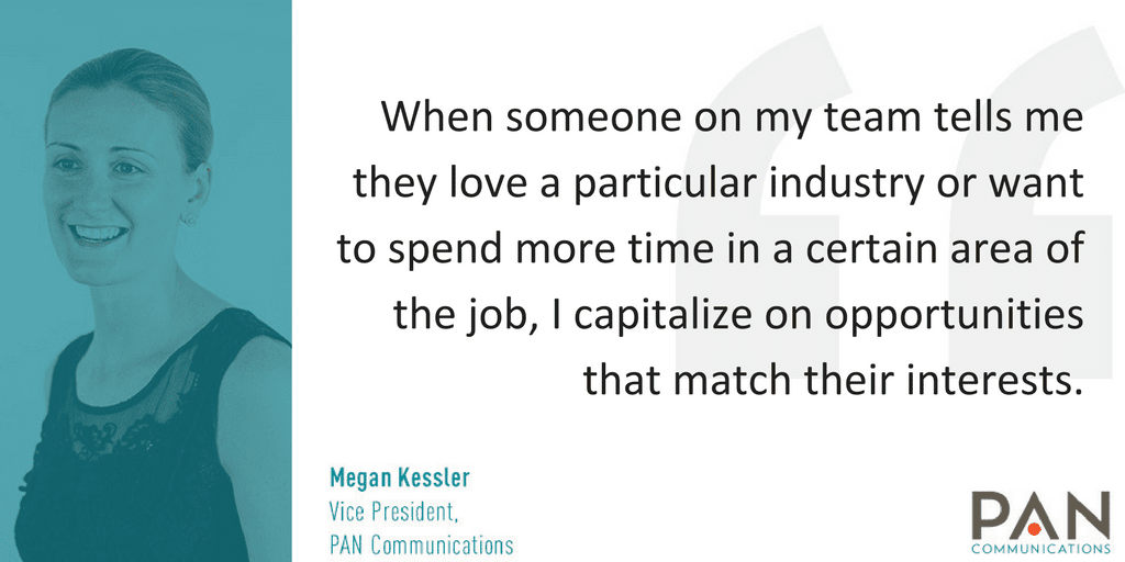 When I meet with my dedicated teams, we always discuss their interests across both the industries/clients they serve and the different skills they use in their roles (i.e., writing, pitching, analytics). These conversations help me to advocate on their behalf when management meets each week to discuss staffing of accounts. When someone on my team tells me they love a particular industry or want to spend more time in a certain area of the job, I capitalize on opportunities that match their interests. That’s something we are always doing at PAN – our dedicated VPs are fierce advocates for their teams.